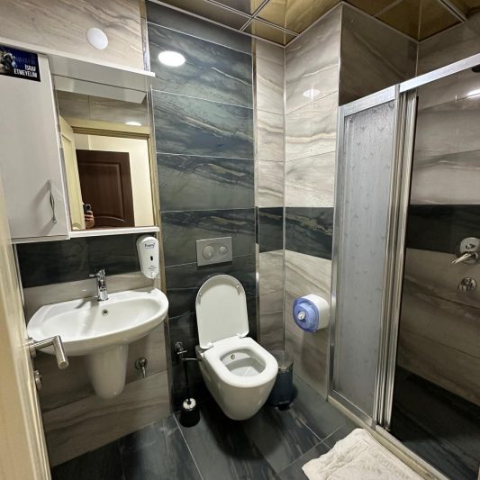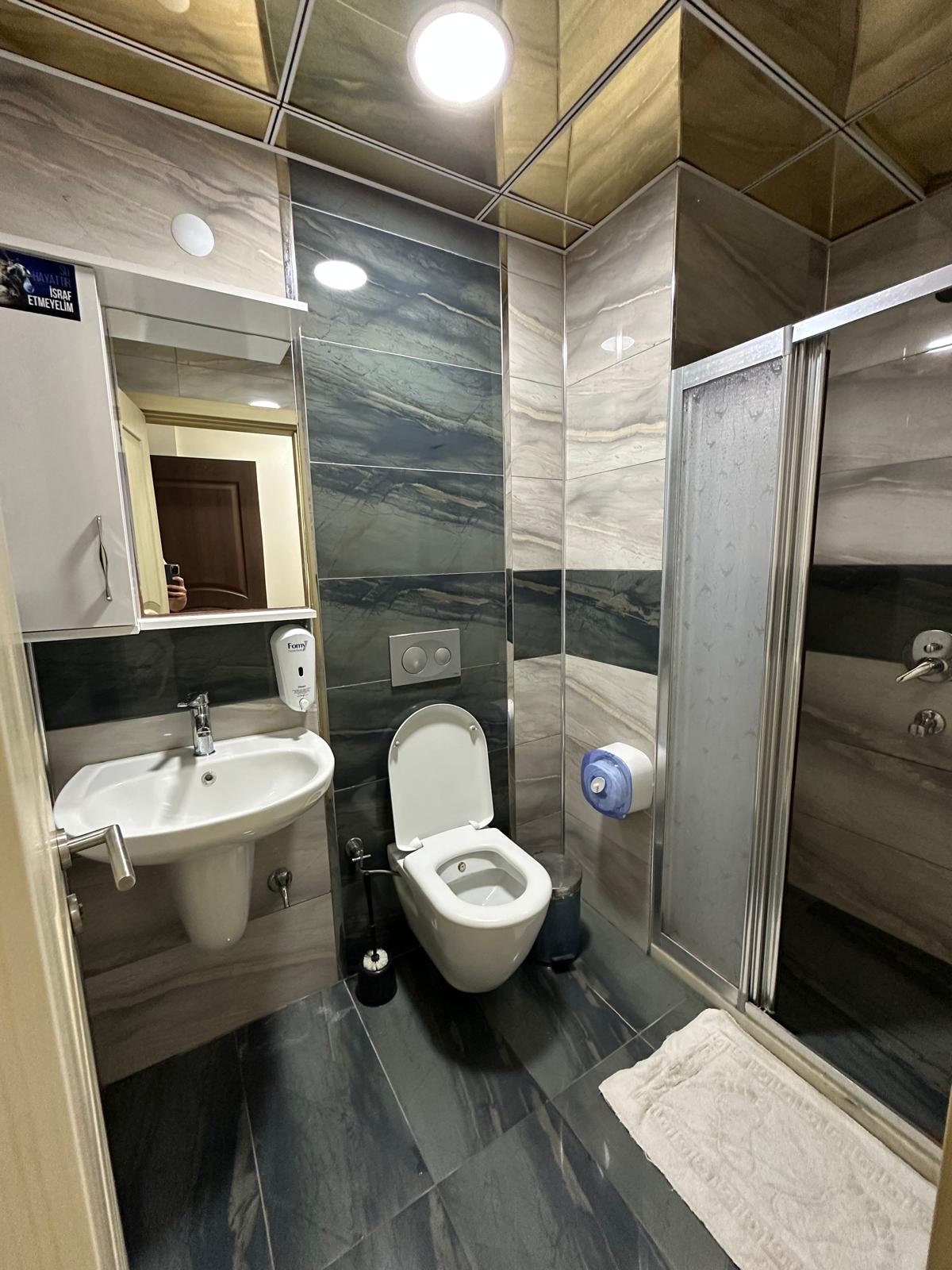 Modern banyosunda duşakabin, lavabo, tuvalet, saç kurutma makinesi ve 24 saat sıcak su mevcuttur. Geniş alanı sayesinde hem çocuklu aileler hem de kalabalık konaklamalar için konforlu bir tatil imkânı sunar.